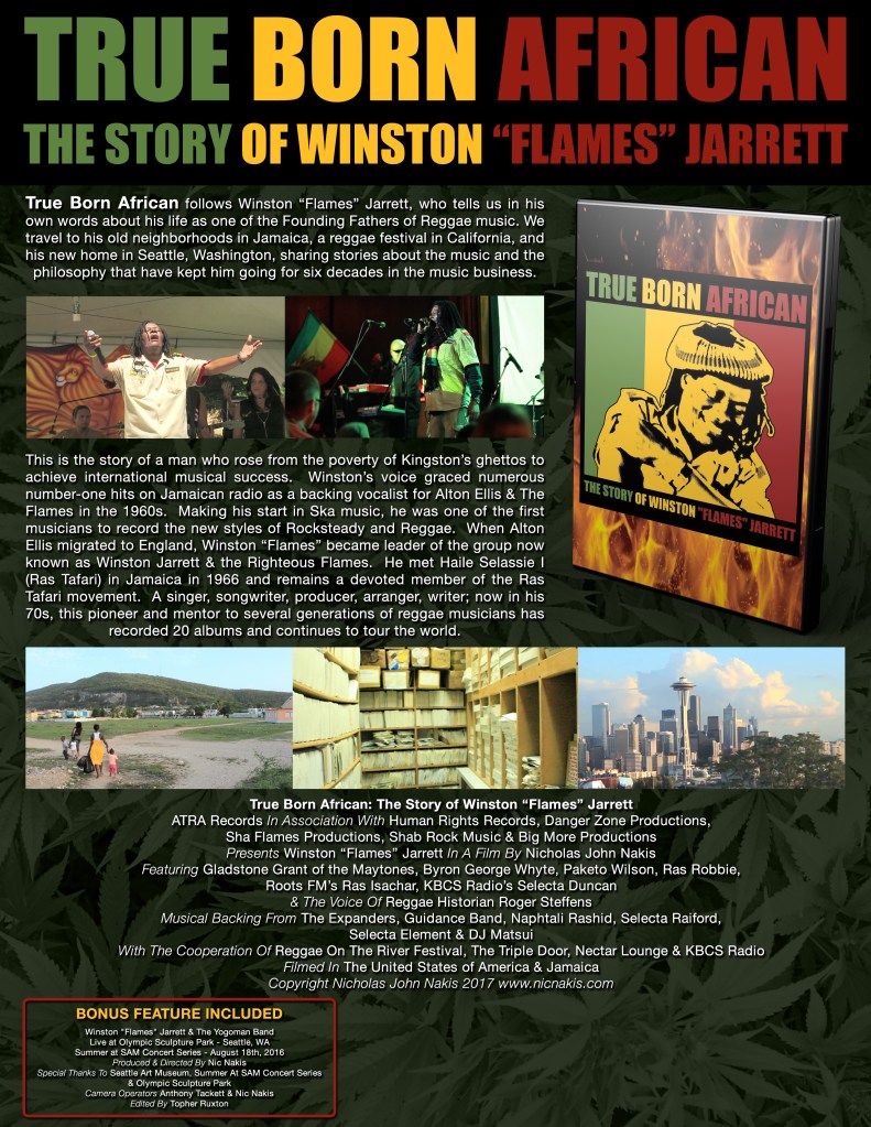 True Born African premiered at the Jamaica International Reggae Film Festival in 2013. There were two screening events in Seattle at that time, one at Scarecrow Video in the University District, and one at Nectar Lounge in Fremont. Kickstarter supporters got DVDs of the film. If you weren’t a Kickstarter supporter, you could watch the film at one of these events, or by purchasing a DVD from Winston at his concerts. There was a private screener on YouTube, and at some point I made that public. It got a few thousand views. In 2016, we had interest from a distribution company. At their request, we created a new live concert film in cooperation with the Seattle Art Museum’s Summer at SAM concert series. This became a special feature on the double-disc collector’s edition DVDs.